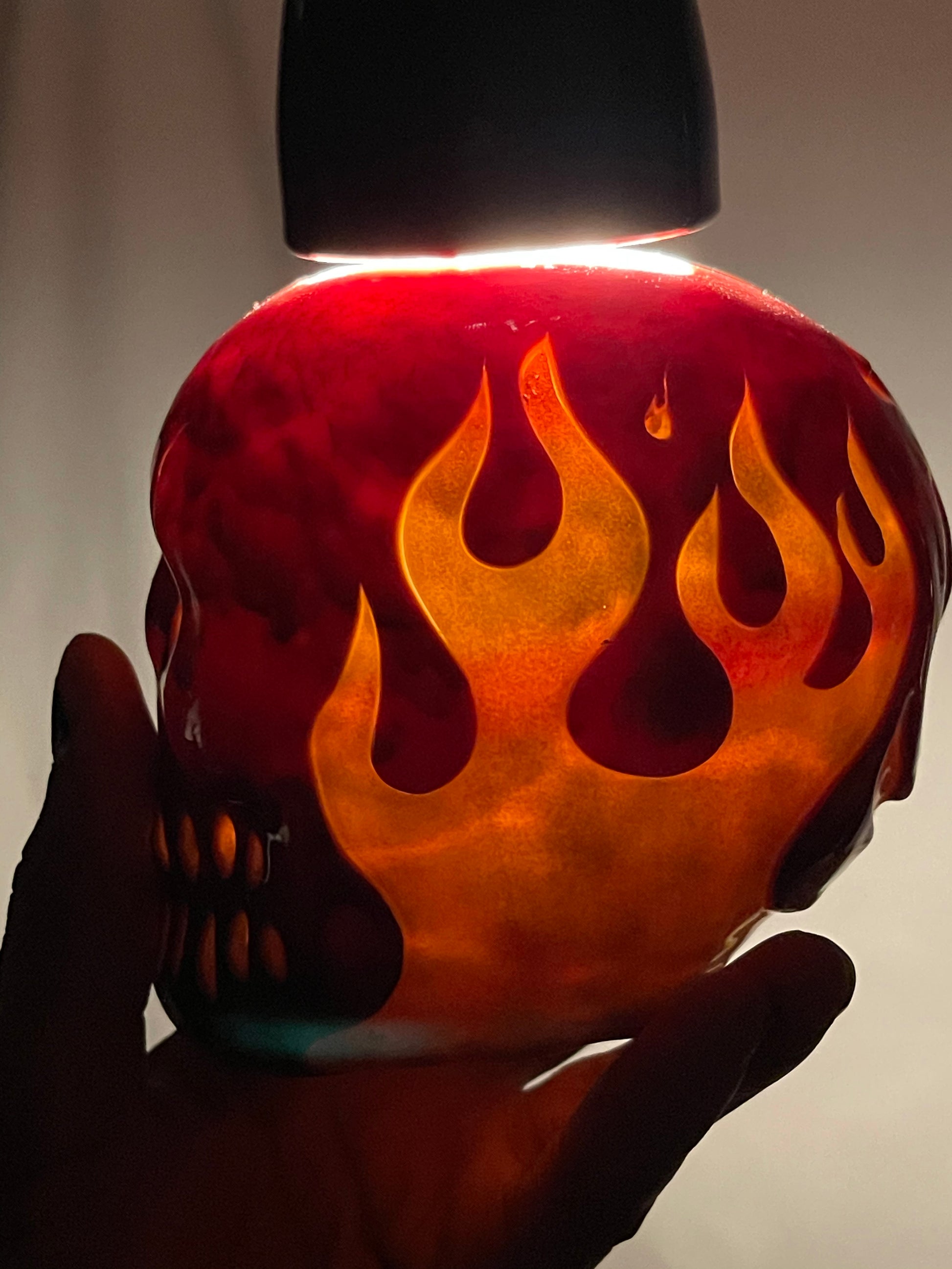 Vela de calavera luminosa tallada a mano única. Con llamas que envuelven la calavera, esta es definitivamente una obra de arte destacada. Hecha de cera de parafina 100%; sin aroma. Tallada completamente a mano alzada. Todas las velas están diseñadas para brillar en el momento en que enciendes la mecha, sin embargo, dan lo mejor de sí en una habitación oscura. "Recargable" con velas de té, LED o velas votivas, ya que se derrite solo por el centro; se proporcionan instrucciones con cada vela. Disponible en una variedad de opciones de color, ¡selecciona tu elección al realizar el pago! Si no seleccionas una opción de color, recibirás los colores de la foto de archivo. Ten en cuenta que las fotos han sido filtradas y los colores pueden variar levemente con respecto a la vela real.