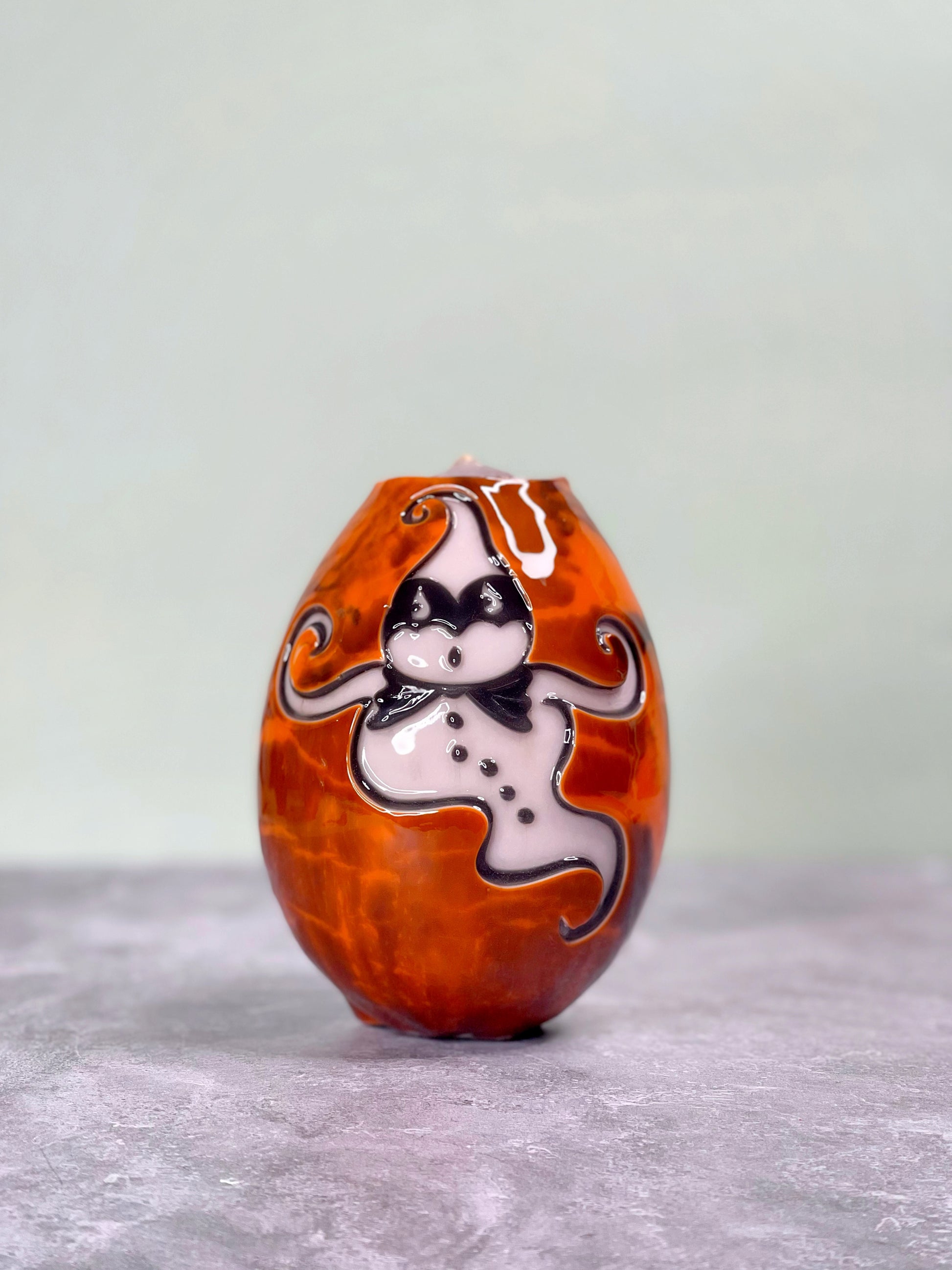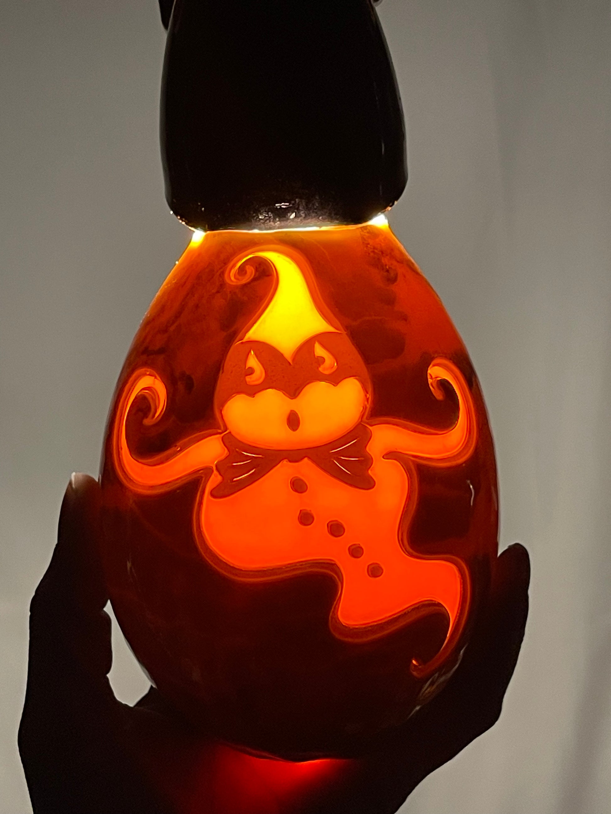 Vela luminosa tallada a mano única. Fabricada con cera de parafina al 100 %; sin aroma. Tallada completamente a mano.