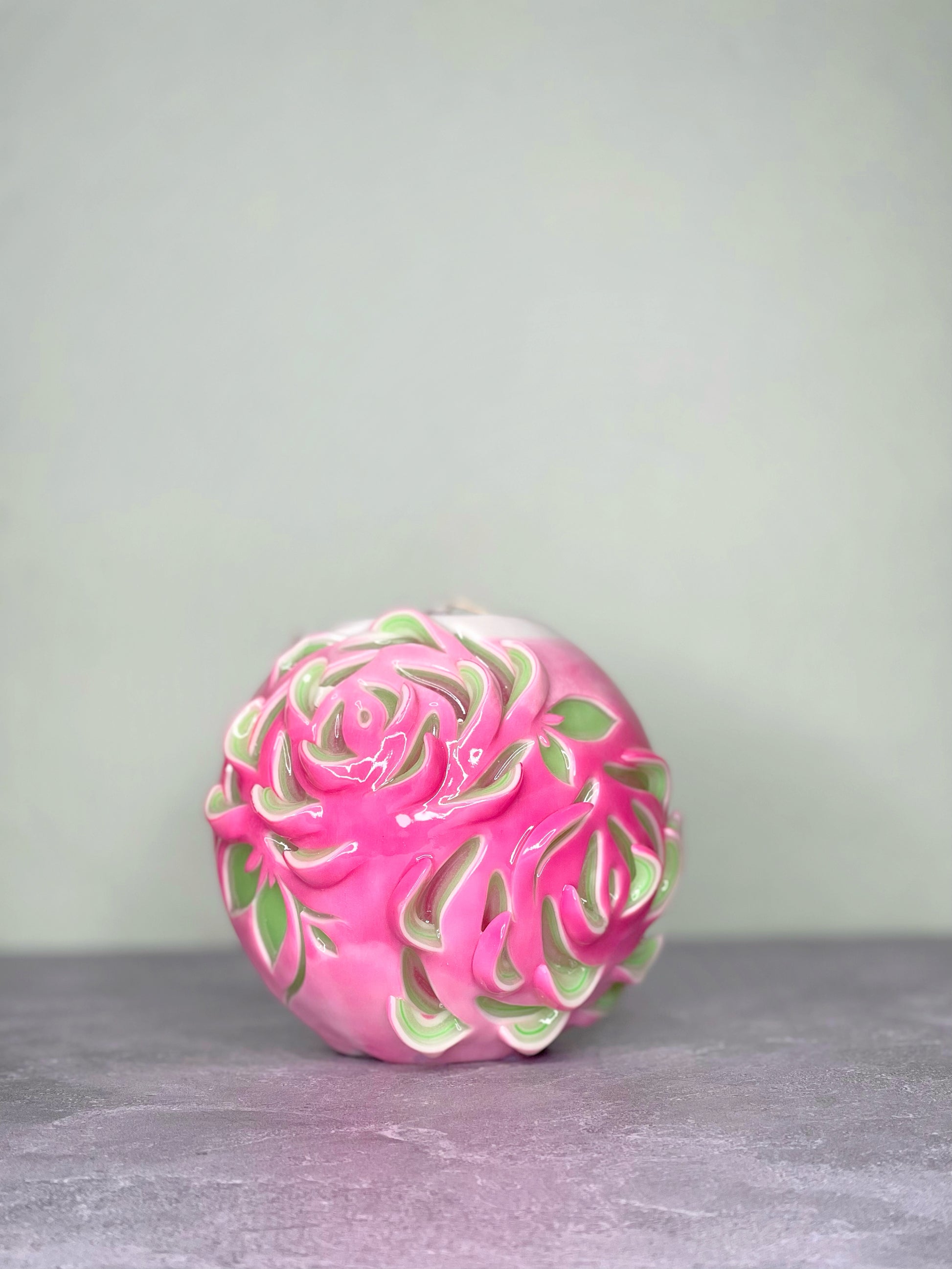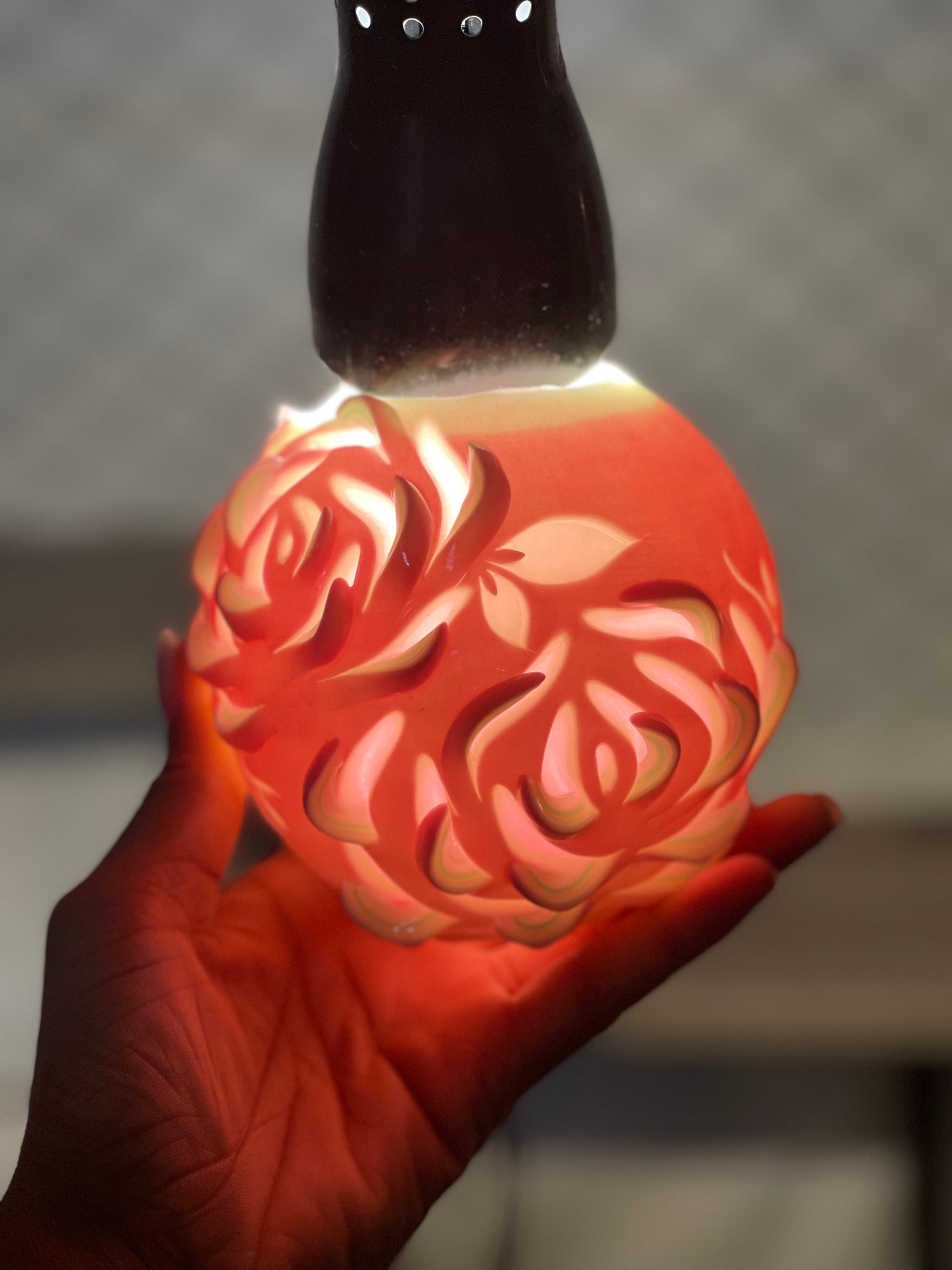 Vela luminosa tallada a mano única. Fabricada con cera de parafina al 100 %; sin aroma. Tallada completamente a mano.