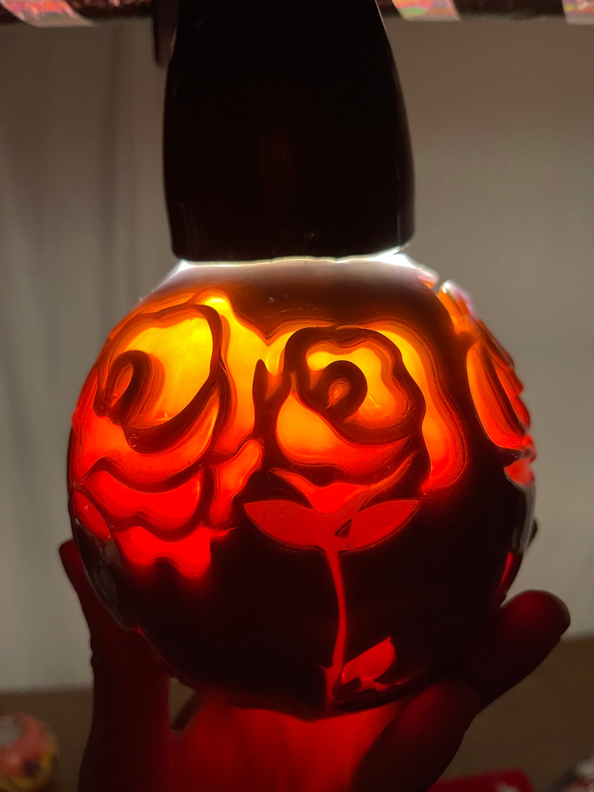 Vela luminosa tallada a mano única. Fabricada con cera de parafina al 100 %; sin aroma. Tallada completamente a mano.
