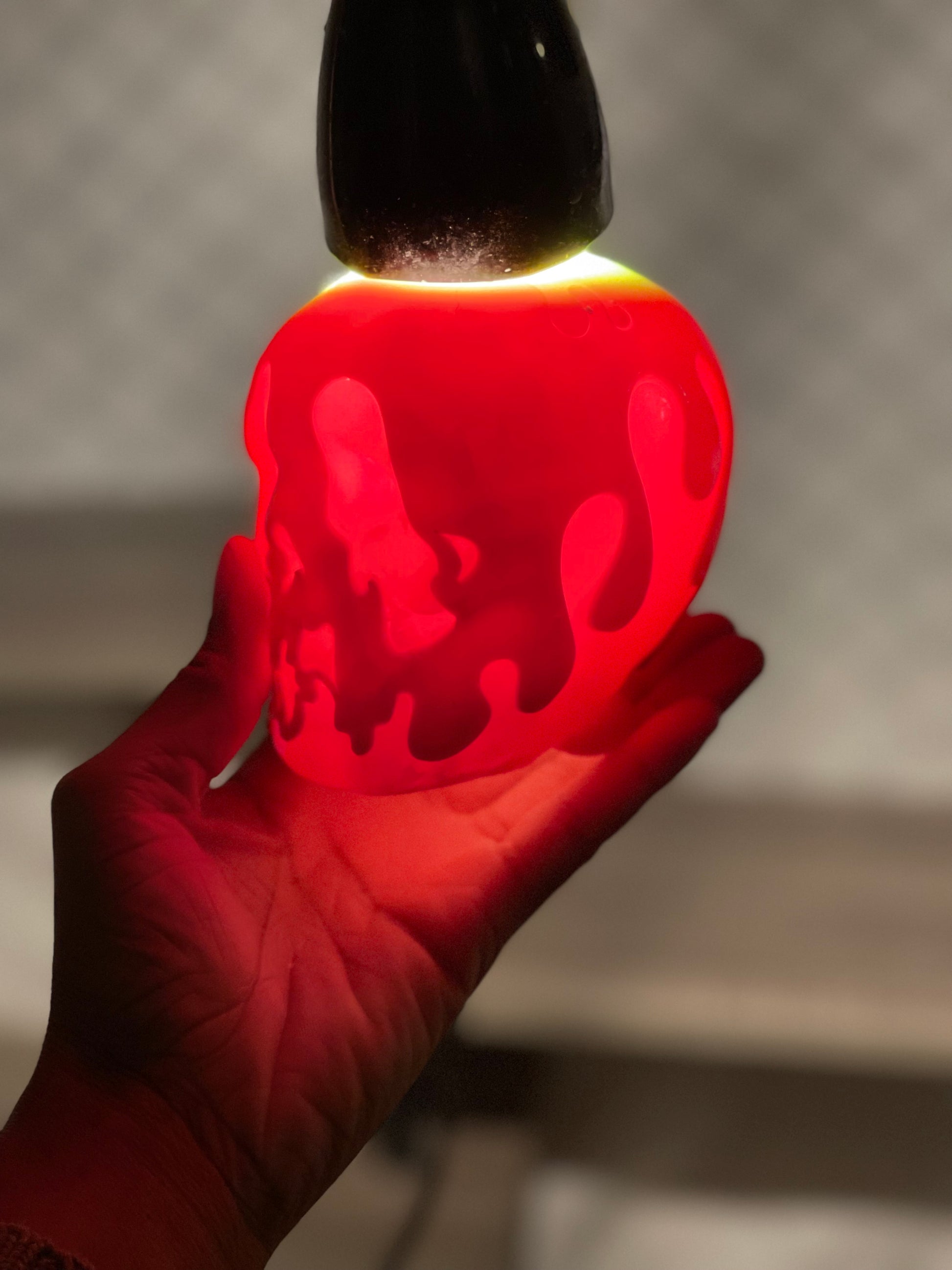 Vela luminosa tallada a mano única. Fabricada con cera de parafina al 100 %; sin aroma. Tallada completamente a mano.
