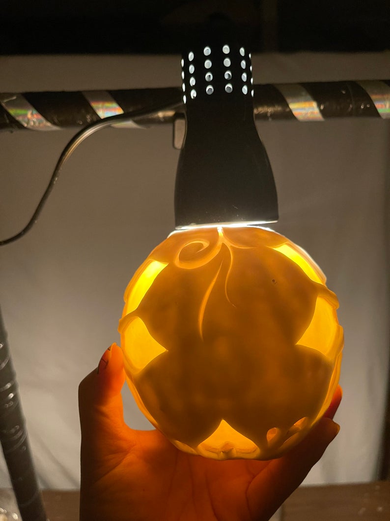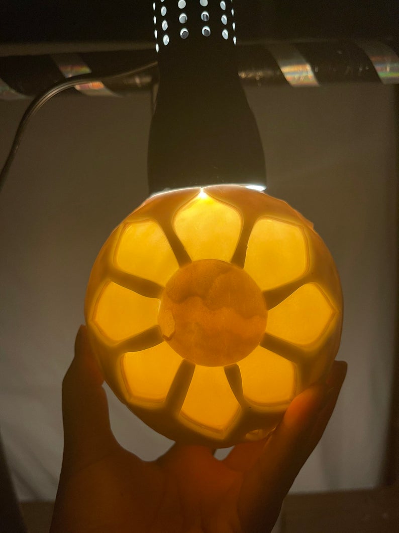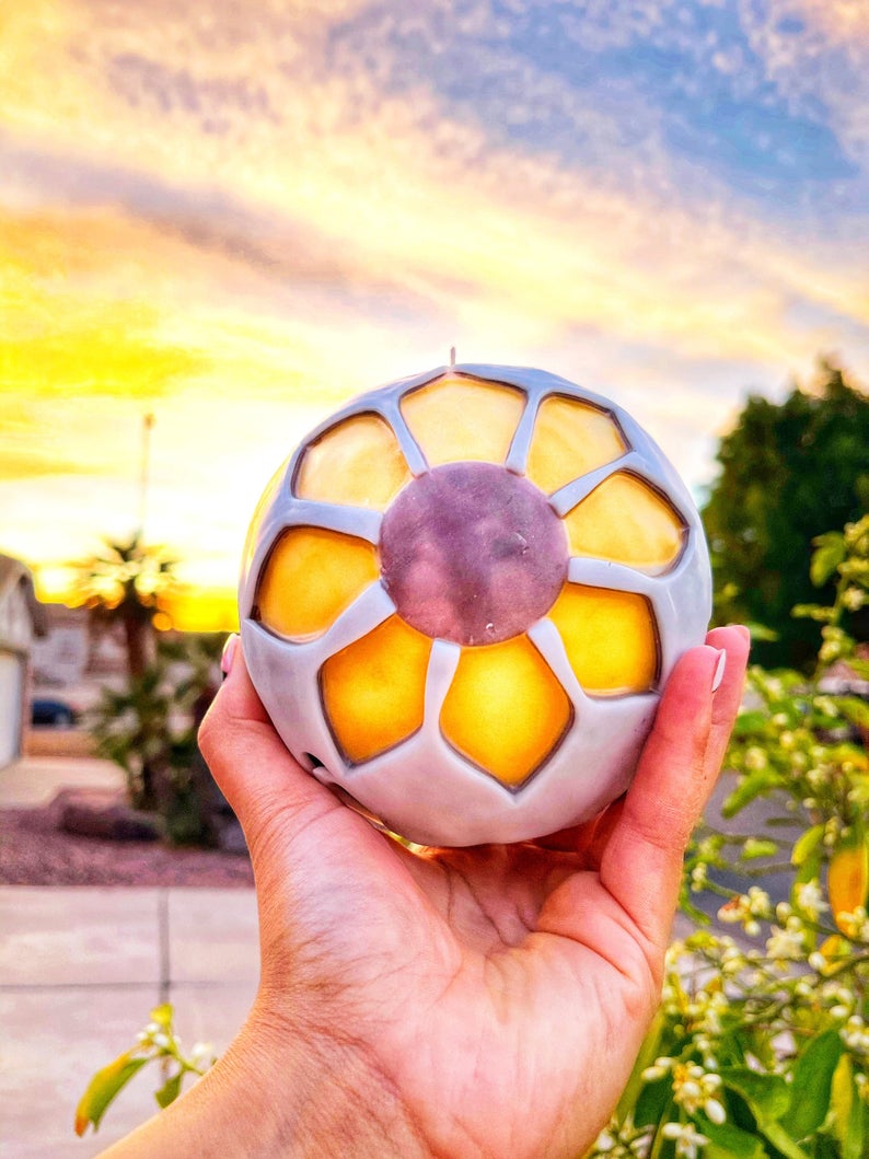 Vela de girasol brillante tallada a mano única. Presenta una flor en ambos lados y diseños abstractos en el medio. Fabricada con cera de parafina 100 %; sin aroma. Tallada completamente a mano alzada. Todas las velas están diseñadas para brillar en el momento en que enciendes la mecha, sin embargo, dan lo mejor de sí en una habitación oscura. “Recargable” con velas de té, LED o velas votivas, ya que está diseñada para derretirse solo en el centro; se proporcionan instrucciones con cada vela. Disponible en una variedad de opciones de colores y tamaños, ¡selecciona tu elección al realizar el pago! Si no seleccionas una opción de color, recibirás los colores de la foto de archivo.