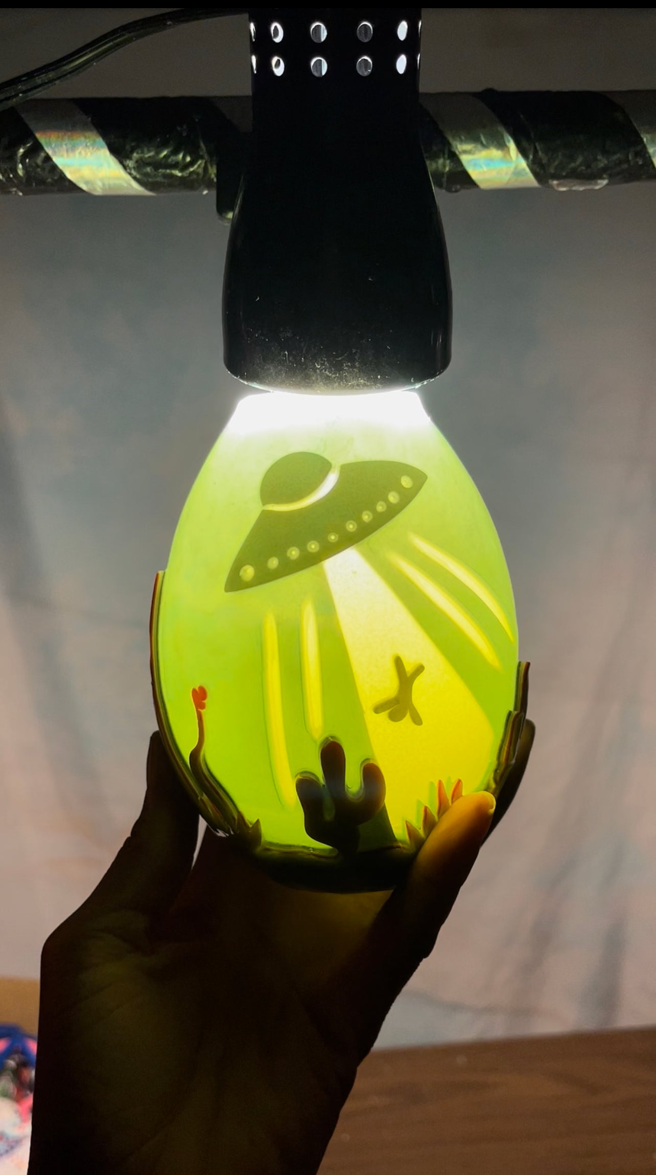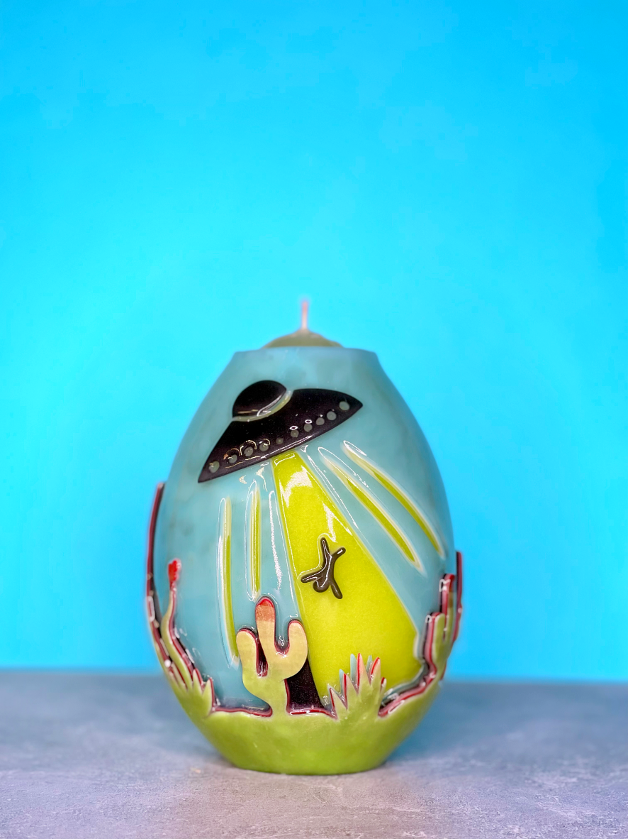 Unique hand-carved glowing candle. Made of 100% paraffin wax; scent free. Carved completely free-hand.