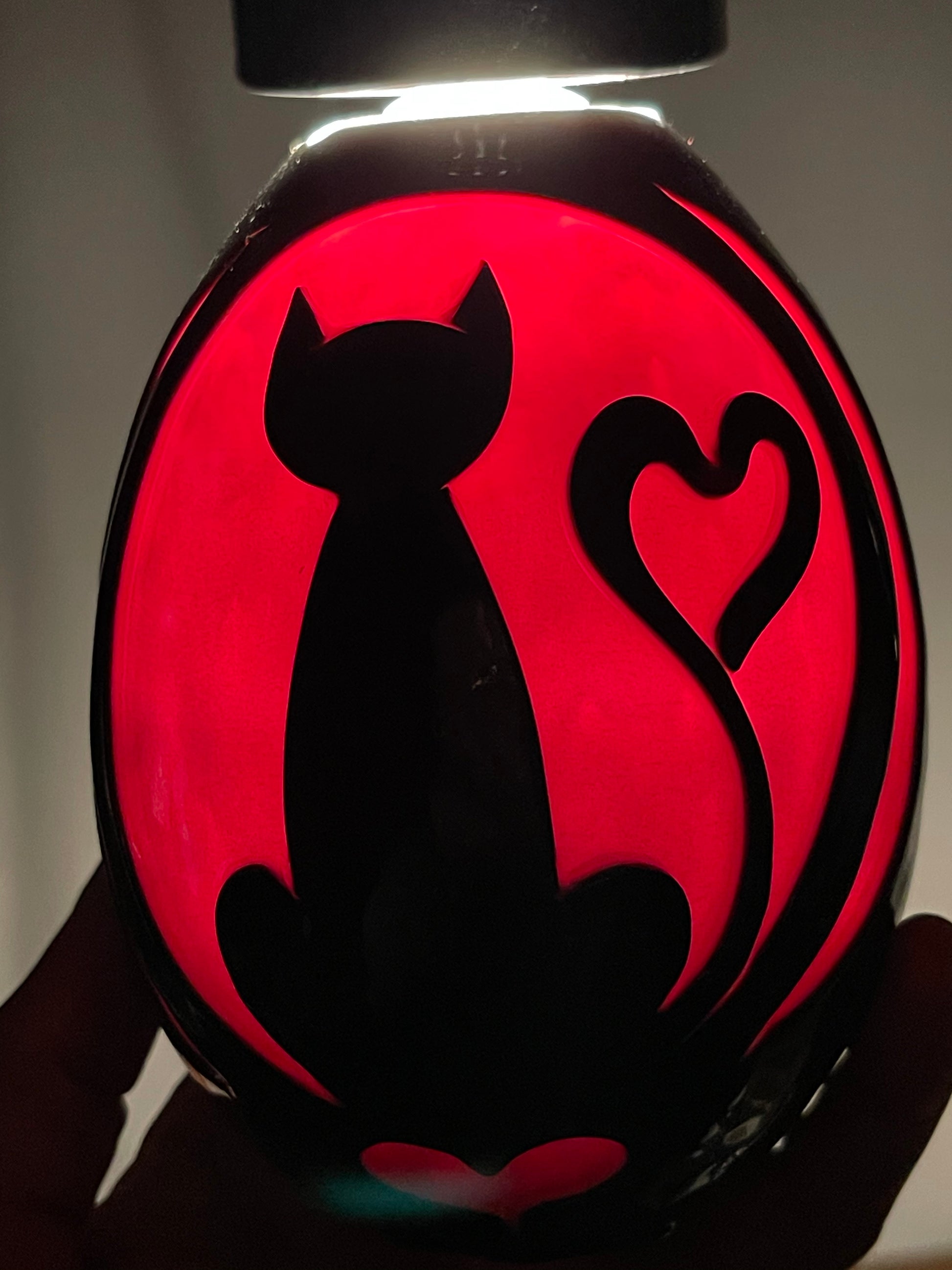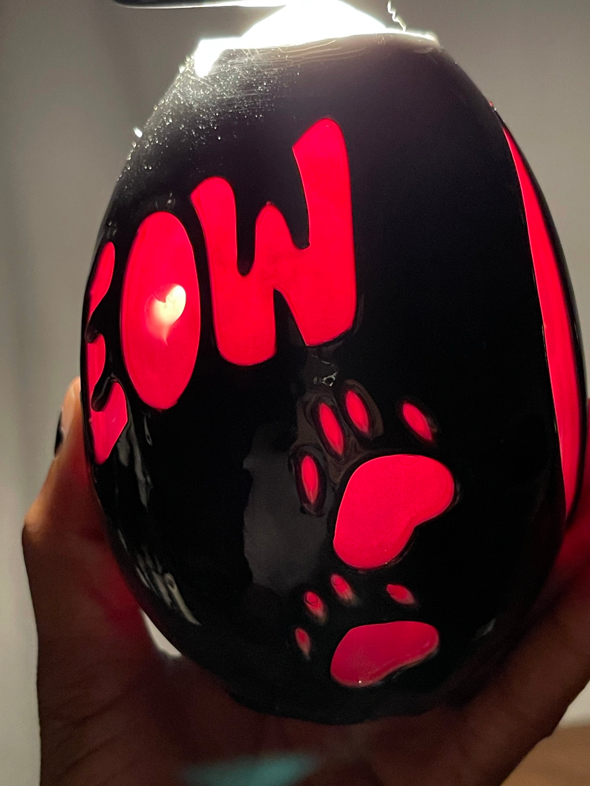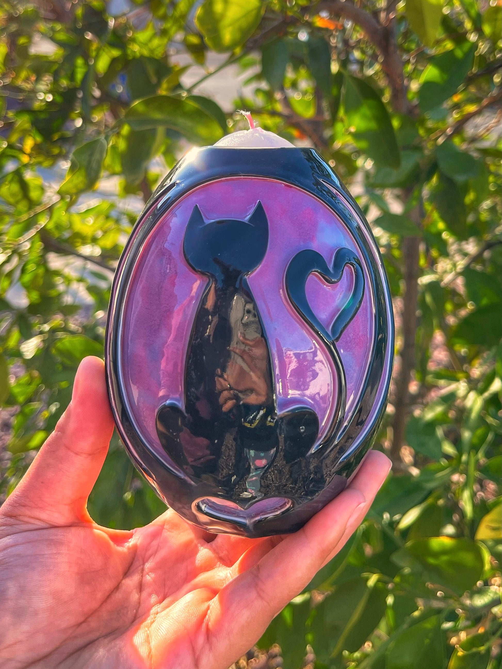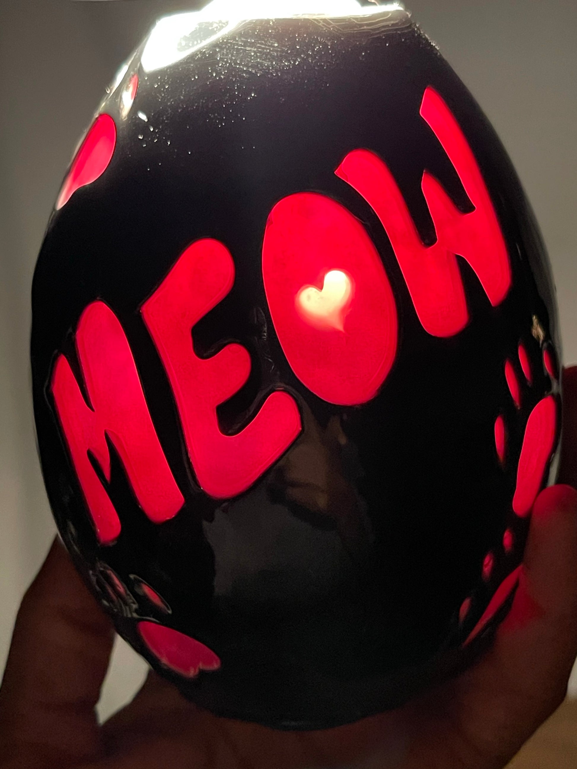 Unique hand-carved glowing cat candle. Featuring a cute heart-tailed cat on one side and the word "MEOW" with paw prints on the other. Made of 100% paraffin wax; scent free. Carved completely free-hand. All candles are designed to glow the moment you light the wick, however they do their best in a dark room. “Refillable” with tealights, leds, or votives as it melts down the center only; instructions provided with every candle.