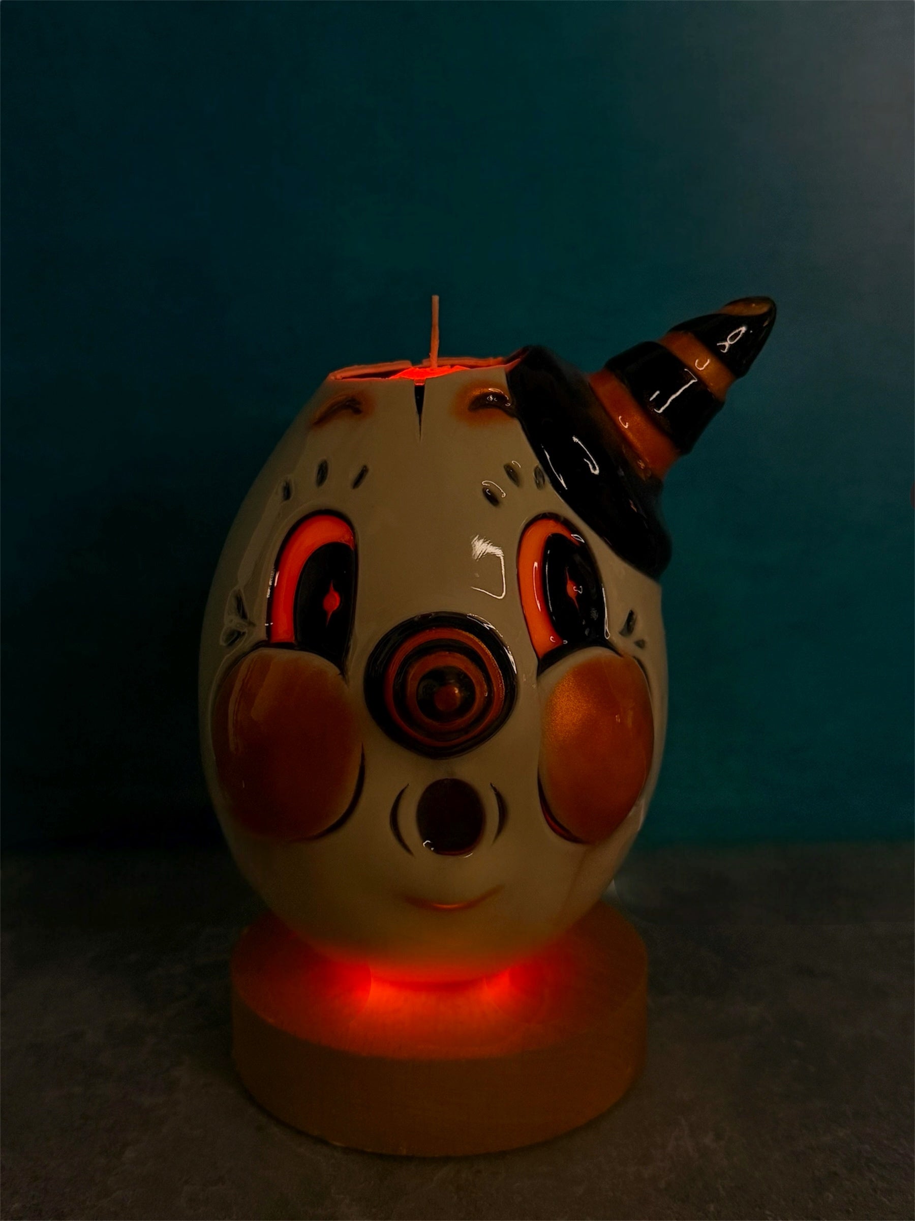 Unique hand-carved glowing candle. Made of 100% paraffin wax; scent free. Carved completely free-hand.