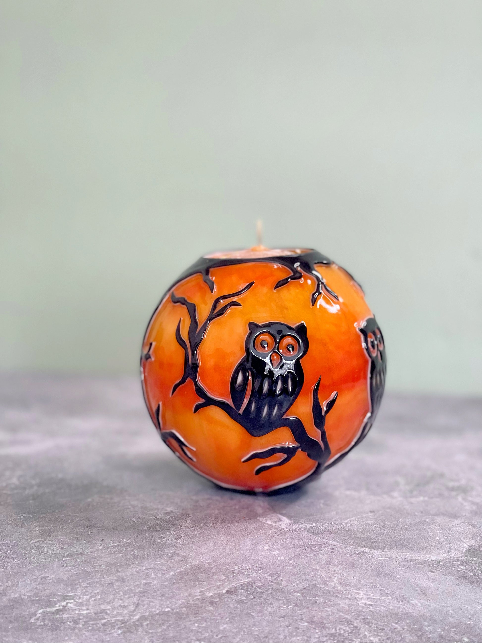 Unique hand-carved glowing candle. Made of 100% paraffin wax; scent free. Carved completely free-hand.